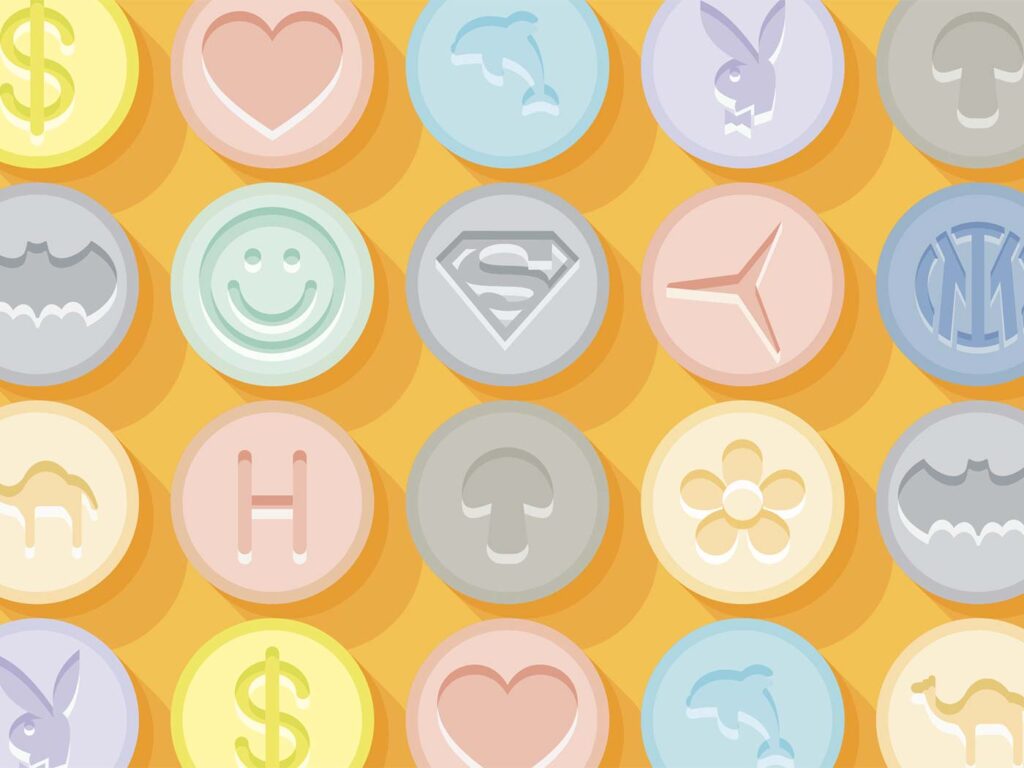 Le designer drugs sono, per definizione, molecole di sintesi, per lo più analoghi derivati di sostanze già note, prodotte, di volta in volta, illecitamente allo scopo di evitare sanzioni conseguenti a produzione, detenzione e vendita di principi attivi che rientrano nelle Tabelle delle Sostanze Controllate. Tra queste ricordiamo l’ecstasy, un composto chimico derivato dall’amfetamina. Si presenta in forma di pillole, capsule o pastiglie di vario colore con l’indicazione della quantità di dosaggio e quindi con effetti variabili, distinti in psichici e somatici. Il primo e principale effetto è la sensazione paradisiaca che consiste nella capacità di facilitare i rapporti sociali, di aumentare il senso di appartenenza alla tribù globale, di provare empatia per chiunque stia vicino, aumentando la confidenzialità. Un effetto associato è di sentirsi in pace con sé stesso e con il mondo. Tutte le sensazioni sono coinvolte: il tatto in primis, ma anche l’odorato, il gusto e la vista e questo può indurre taluni a toccare ripetutamente tessuti od oggetti o a fiutare più volte cibi e bevande. Inoltre la sostanza produce una stimolazione psicomotoria che consente di affrontare per ore la fatica del ballo, se si è in discoteca, rimuovendo i preziosi indicatori fisiologici del senso di stanchezza, della fame della sete, del sonno e perfino del dolore. Alcuni effetti fisici sono di grado modesto come l’aumento dei battiti cardiaci, l’incremento della pressione arteriosa, l’aumento della frequenza respiratoria, l’aumento del glucosio nel sangue e la dilatazione delle pupille. Altri effetti sono più gravi: sudorazione profusa, secchezza della bocca così netta da far venire la lingua a penzoloni, urgenza di mingere, brividi, pelle d’oca e ipertermia. Tra gli effetti collaterali possono anche comparire sintomi decisamente patologici: nausea e vomito, cefalea intensa, atassia (difficoltà di deambulazione), visione confusa, nistagmo (oscillazione ritmica dei bulbi oculari), bruxismo (digrignazione incontrollata dei denti con possibili erosioni dentarie, trisma (contrazione persistente dei masseteri, con conseguente difficoltà sia di parlare sia di aprire la bocca), dolorosi crampi muscolari degli arti che possono durare anche giorni. Cessato l’effetto stimolante, subentra spesso uno stato di profonda spossatezza con sonnolenza. Sono stati registrati casi di morti improvvise di consumatori di ecstasy. La drammatica situazione di emergenza che si può verificare di collasso cardiocircolatorio, insufficienza respiratoria acuta, convulsioni, coagulazione intravascolare disseminata e insufficienza renale grave richiede ovviamente un pronto intervento ospedaliero se si vuole evitare l’esito letale entro poche ore. L’ecstasy può dare dipendenza.